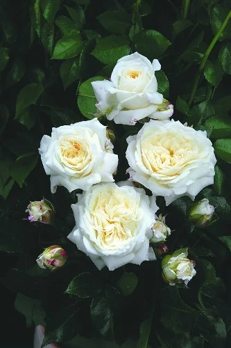 Superbe coloris blanc ivoire, 70 à 75 pétales, diamètre fleur 8 à 10 cm. Parfum au caractère puissant acidulé et poivré. Feuillage vert brillant, excellente résistance aux maladies. Floraison en grappe de 10 à 12 fleurs.