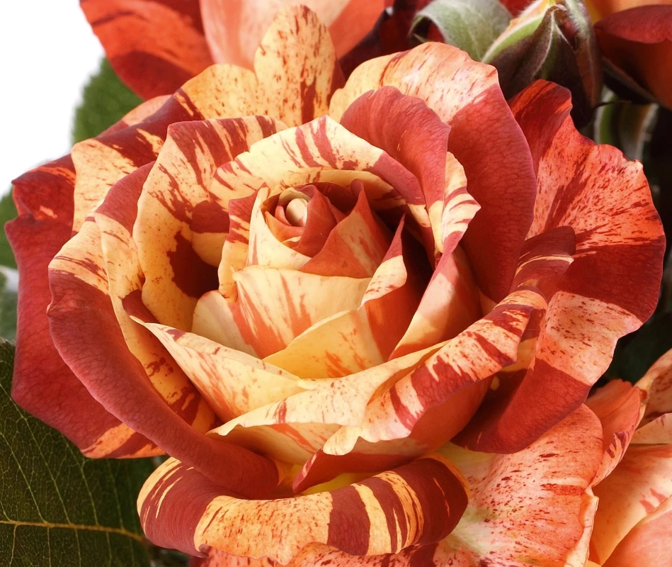 Ce rosier est très original. La rose est de couleur brune avec des stries de couleur jaune et orange. Son feuillage est vert brun brillant. Cette fleur a une forme double, elle est composée de 35 pétales et mesure 8 cm. La plante a un port érigé, sa végétation est très forte et dense. Sa floraison s'avère être abondante et remontante. La plante a une inflorescence de 3 à 5 fleurs. La rose Poséidon s’impose comme l’une des références paysagères incontournables pour aménager son jardin. La plante diffuse un parfum léger. Utilisation : En isolé, par groupe de 2 ou 3, haie Récompense : Médaille d'Or, Barcelone