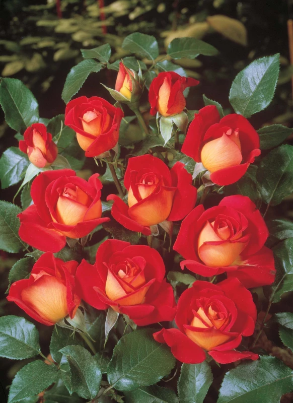Ce rosier est magnifique avec son effet bicolore ! Ses grandes fleurs sont sensuelles avec leurs légères pétales alliant subtilement leur tendre jaune citron à un vigoureux rouge fraise. Le feuillage est vert foncé brillant. Cette rose a une forme turbinée, elle est constituée de 45 pétales et mesure un diamètre de 9 cm. Son inflorescence se fait en grappe de 3 à 5 fleurs. Sa végétation est régulière et homogène. Récompense : - Médaille d'Argent Saverne 1985 - Médaille d'Or La Haye (Pays-Bas) 1985 - Médaille d'Or Monza (Italie) 1985