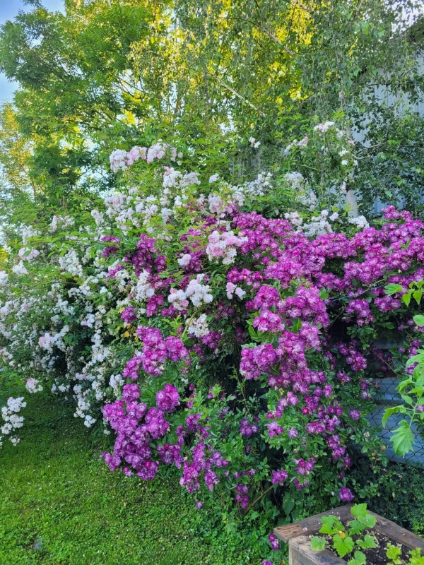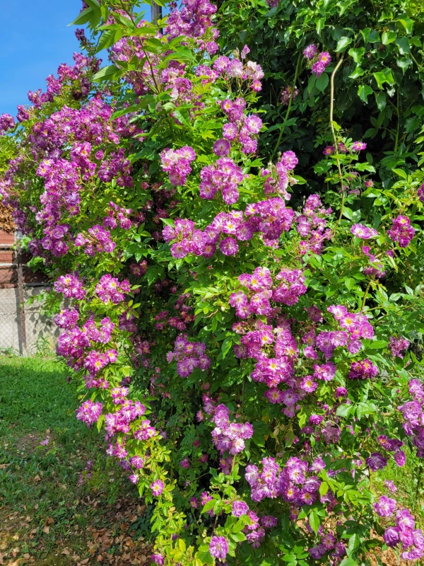 L’originalité du rosier liane Veilchenblau provient ses petites fleurs violettes au cœur blanc. Les rameaux vigoureux presque sans épines s’habillent d’un feuillage vert pomme et se recouvrent de bouquet de roses semi-doubles en fin de printemps.
