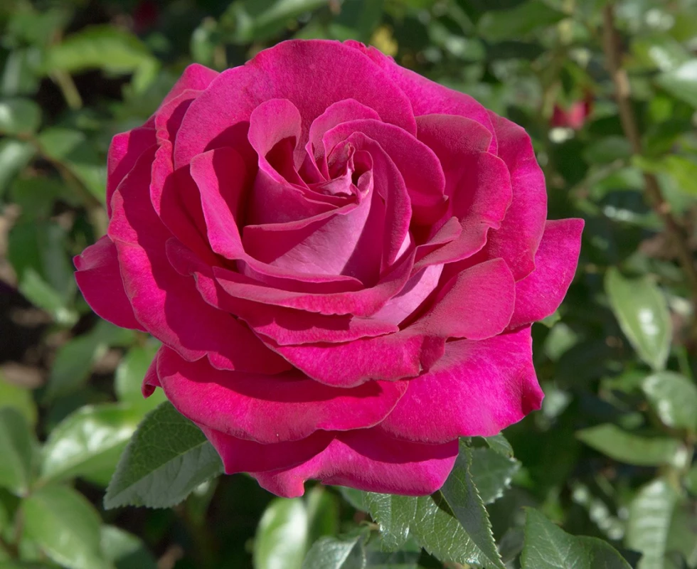 This rose is gorgeous! It is dedicated to the Chic and Art Deco Palace Belles Rives. The flowers are cherry pink with glossy dark green foliage making this a glamorous rose. The roses are of a traditional shape. Each rose is made up of 35 petals and measures 12 cm in diameter. The plant has an erect habit and its vegetation is vigorous. Its flowering is renewed from spring until frost. The fragrance is powerful rosé and fruity.
