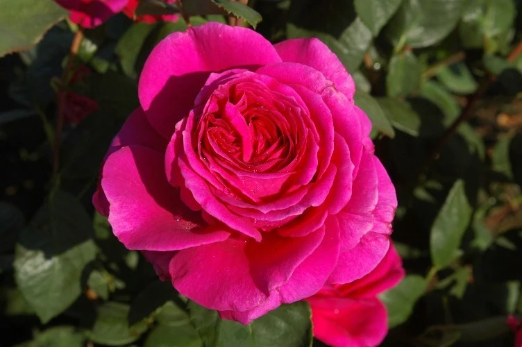 Diese große und schöne Rose mit einem fuchsia-karmesinroten Blütenblatt und dunkelgrünen Blättern wird sich perfekt in Ihren Plantagen zu Hause fühlen. Sie besteht aus 50 Blütenblättern und hat einen Durchmesser von 12 cm. Sein Duft ist intensiv. Diese kräftige Pflanze ist einblütig und wiederholt blühend.