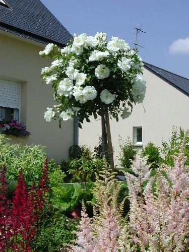 Hochstammrosen und weinende sind rosen, auch veredelt, nicht am boden, sondern in eine variable höhe von 0,60 bis 1,40 m. Sie bilden zusammen eine kleine « welle » mit einem stamm, dass es passt (wie die krone) zu schützen vor der kälte im winter. Rose, stab-oder überhängend sich am ende des winters.