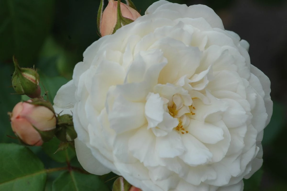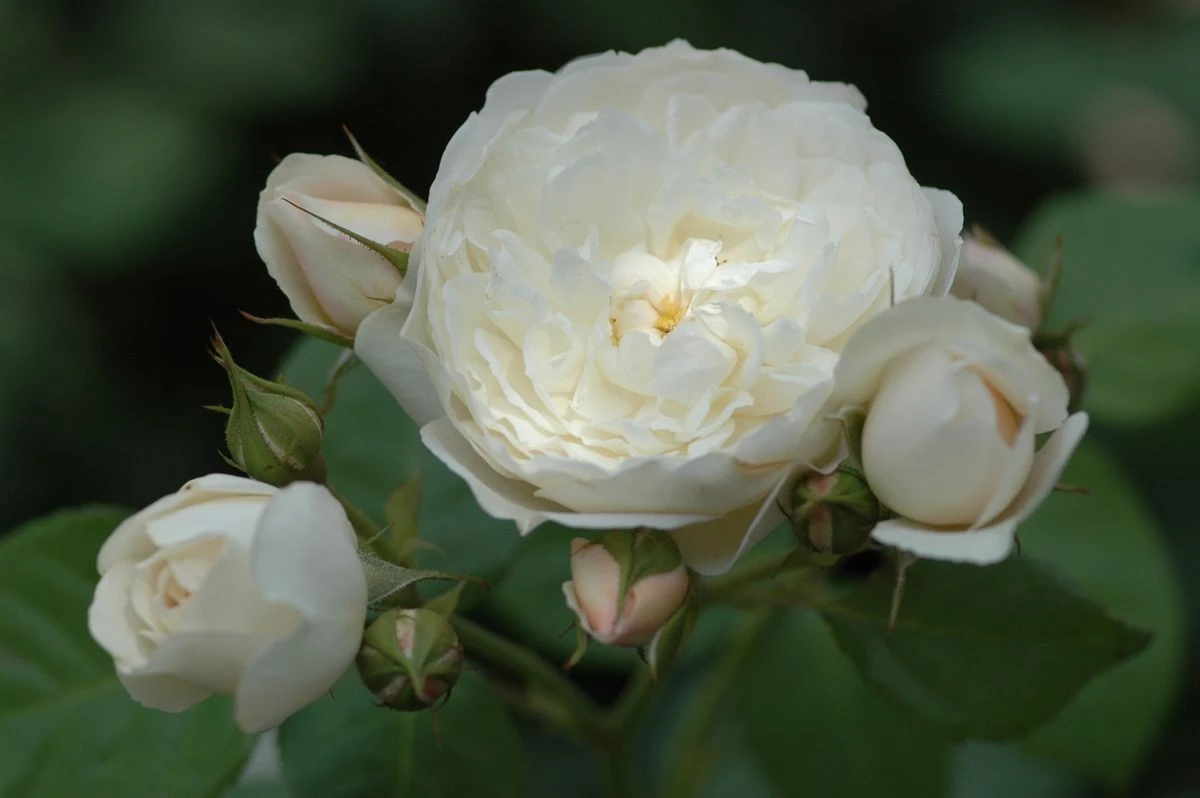 Bringt den ganzen Sommer über weiße, flach schalenförmige, vollblättrige Blüten mit beeindruckender Regelmäßigkeit hervor. Sie duften nach reiner Myrrhe. Sie bildet einen attraktiven Strauch mit buschigem und relativ aufrechtem Wuchs. Benannt, um die königliche Hochzeit zu feiern.