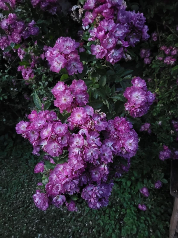 Es ist eine prächtige Schlingrose! Die jungen Blütenblätter sind tief magentafarben, dann nehmen die Blütenblätter eine amethyst- oder malvengraue oder stahlblaue Farbe an. Die Rose hat ein weißes Herz, das von einem Strauß goldener Staubblätter überragt wird. Der Durchmesser der Blüte beträgt 4 cm. Diese Pflanze hat einen doppelten Blütenstand, sie ist sehr reichblühend. Diese Rose duftet nach Maiglöckchen. Ihre Blüte ist nicht remontant.