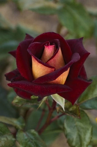 The most Rock'n Roll of Meilland roses! Eddy Mitchell wanted a black rose as a reminder of his "Black Socks" period. The flowers are of a very original color with almost black velvety red petals and golden yellow underside. The foliage is dense and dark green. The plant has a bushy habit, its flowering is continuous from spring until frost. It also has a strong vegetation. Each rose has a total of 27 petals and measures 10 cm in diameter. The rose has an inflorescence which is made from 2 to 5 flowers.