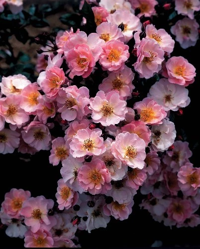 It is a very beautiful rosebush with many small flowers. The flowers are pink in gradation and its foliage is dark green. The rose has a cup shape, its number of petals is 15, and its diameter is 4 cm. The plant has a supple, drooping habit and its growth is vigorous. The rosebush has a remarkable and remontant flowering. This plant has a cluster inflorescence of 30-40 flowers. Without perfume.