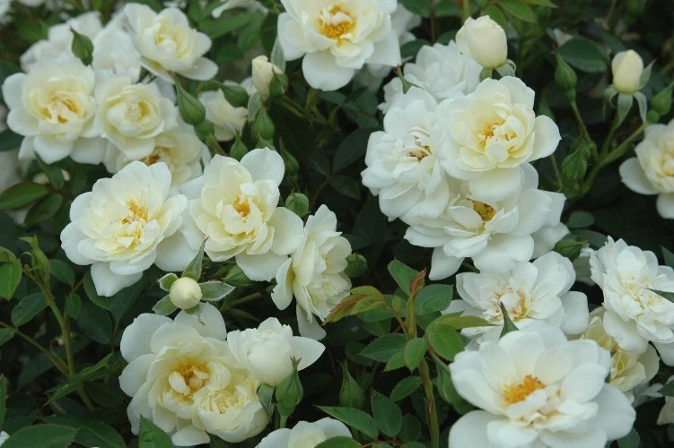 Esta variedad se presta a todos los terrenos y todas las situaciones: ¡florece incluso a la sombra! La rosa es de color blanco y crema con hermosos estambres dorados en el centro. Su follaje es pequeño y de color verde oscuro. La planta tiene un total de 25 pétalos. Esta rosa tiene un crecimiento vigoroso y muy florífero. A nivel de plantación, puedes plantar de 3 a 4 por metro cuadrado.